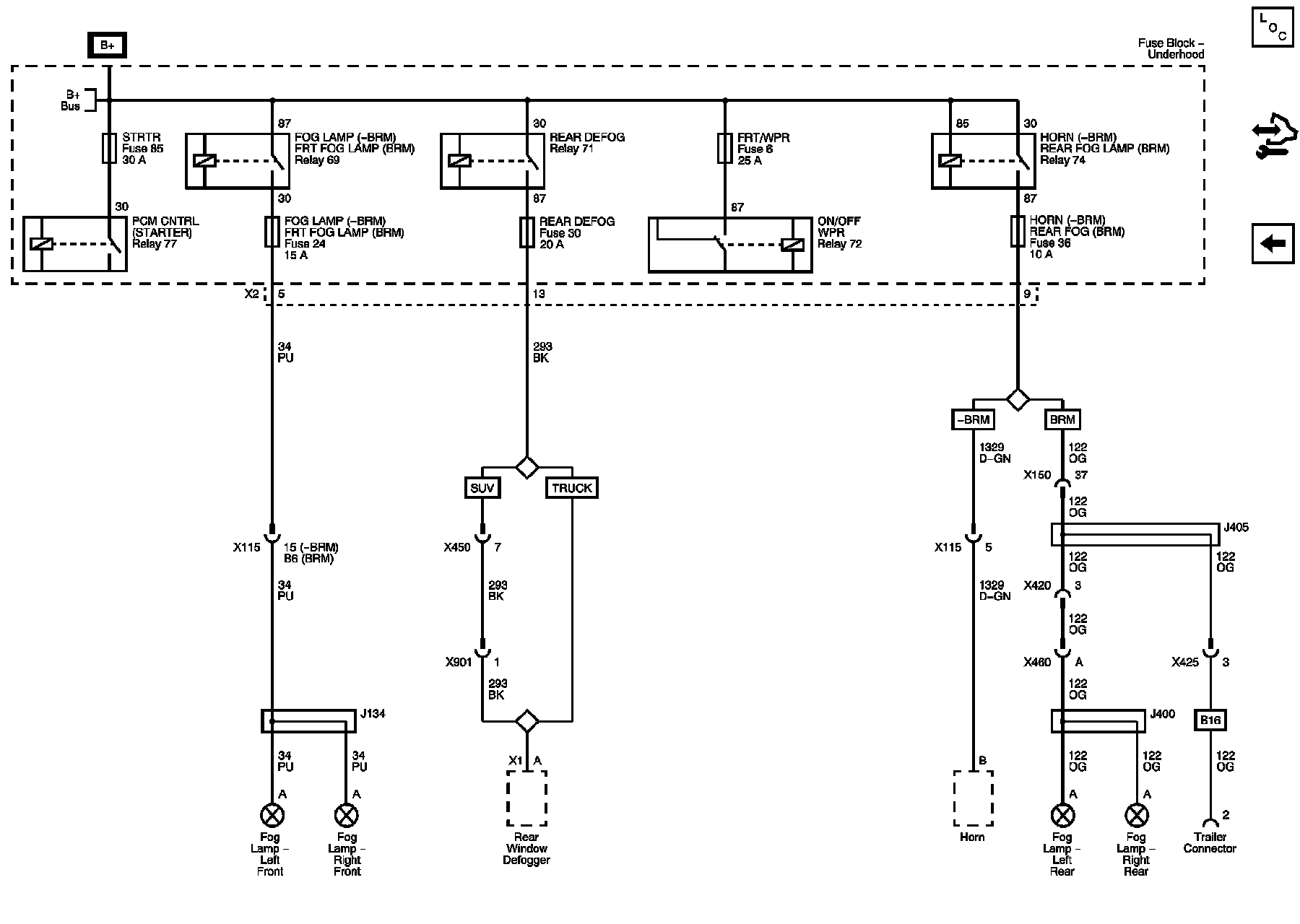 FOG LAMP (without BRM), FRT FOG LAMP (BRM), FRT/WPR, HORN (without BRM), REAR DEFOG, REAR FOG LAMP (BRM), and STRTR Fuses