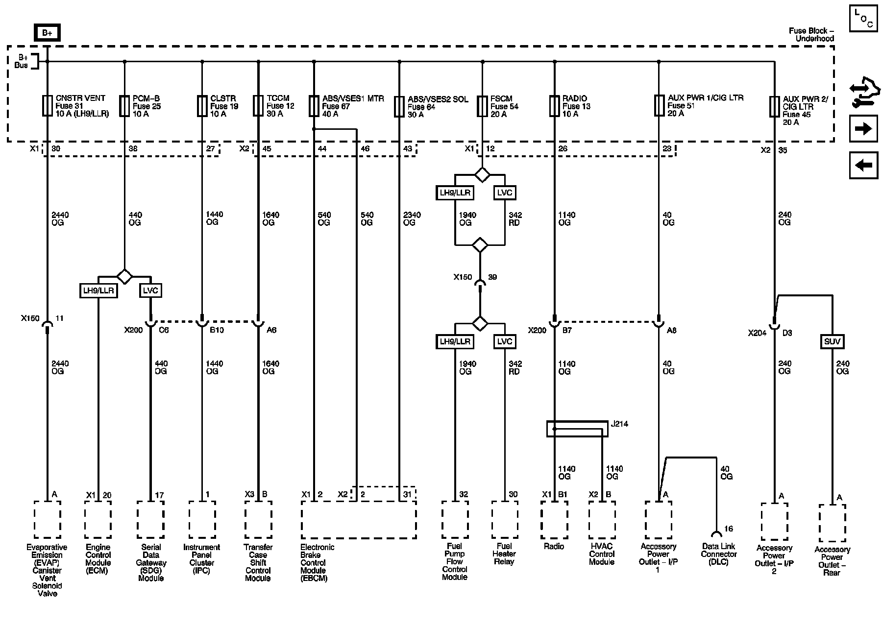 ABS/VSES1 - MTR, ABS/VSES2 - SOL, AUX PWR 1, AUX PWR 2, CLSTR, CNSTR VENT, PCM-B, RDO, STOP, and TCCM Fuses