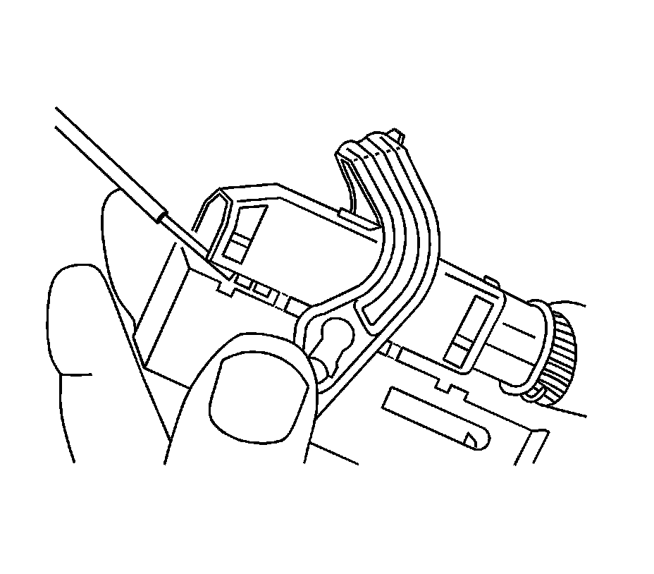 9. Remove the terminal position assurance (TPA) by inserting a small flat-bladed tool into the small slot in the end of the slider and pushing on the TPA until it comes out of the connector. When the TPA exits the opposite side of the connector, gasp the TPA and pull it completely out of the connector.