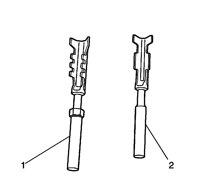 Note: There are 2 styles of Micro-Pack 100W terminals which are very similar. Ensure that you have the correct terminal before crimping the new terminal to the wire. The first design connector uses the longer terminal (1) that has a raised area in front of the recess in the terminal. The second design connector uses the shorter terminal without the raised area.