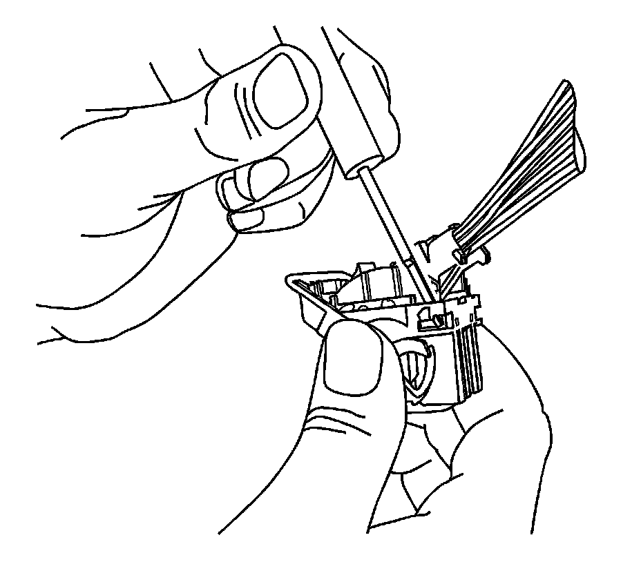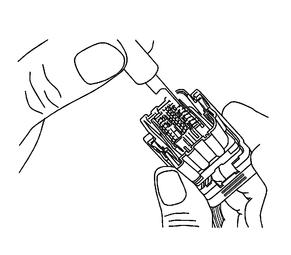 6. Using terminal release tool J-38125-215A, place the tip of the tool on the outside edge next to the terminal and depress the lock tab and remove the rear of the connector body.