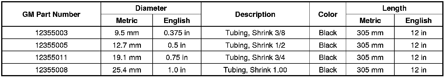 If the wire insulation has been chafed, or broken, enough to show the conductive portion of the wire, and the wire is not damaged, determine the length of insulation that needs to be repaired. If the repair is less than 280 mm (11 in), cut the wire within the damaged area. Then slide the appropriate heat shrink tubing (listed below) over the wire, and repair the wire by splicing the wires together. Refer to Splicing Copper Wire Using Splice Sleeves (Component Tests and General Diagnostics). Once the wire is spliced together slide heat shrink tubing over the damaged area and apply heat to seal the repaired wire.
