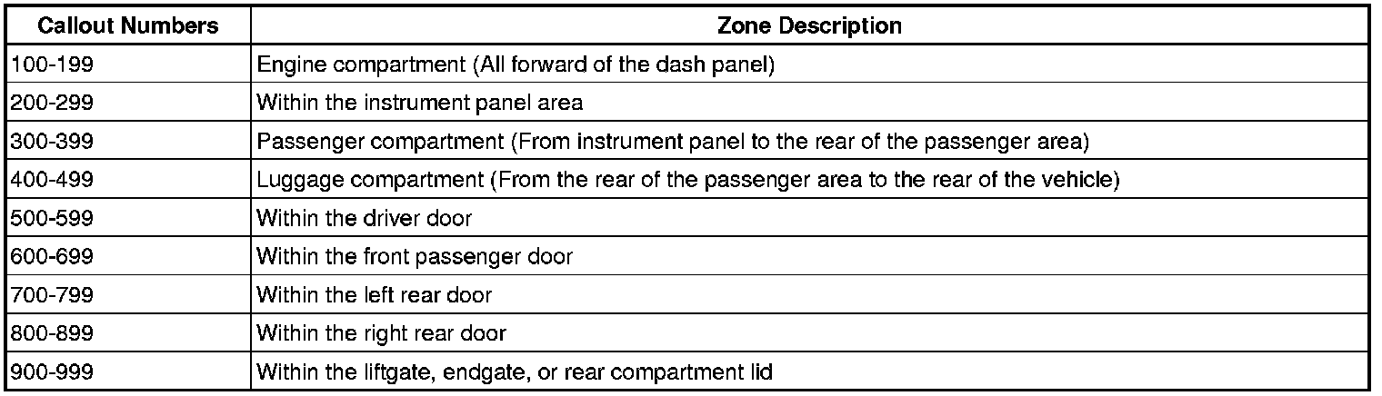 All grounds, in-line connectors, and splices have identifying numbers that correspond to where they are located in the vehicle. The following table explains the numbering system.