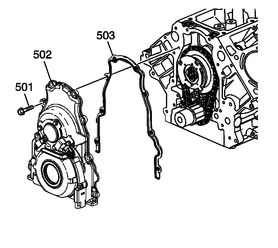 11. Position the NEW engine front cover gasket (503) and front cover (502) to the engine.