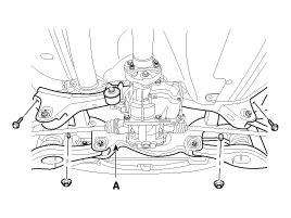 7. Loosen the mounting bolts and then remove the rear cross member (A) with the frame.