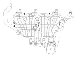 - When installing the intake manifold, tighten the bolts and nuts with pre-torque first, and then tighten the bolts and nuts with specified torque in the sequence shown