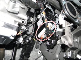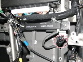 3. Remove the smart key unit (B) after loosening the mounting bolts(2EA) and disconnecting the connector (A).