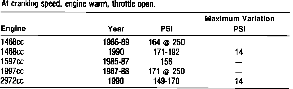 Perform compression test with engine at normal operating temperature, spark plugs removed and throttle wide open. Cylinder compression pressure should be approximately 164 psi at 250 RPM. Maximum variation between cylinders should not exceed 16.4 psi.