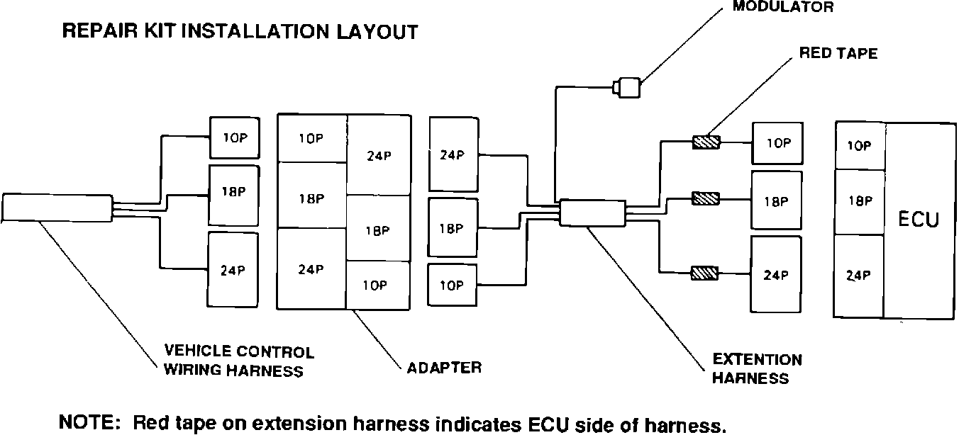 8. Connect the remaining extension harness connectors (the end with red tape) to the ECU and the control harness connectors to the adapter (see layout)
