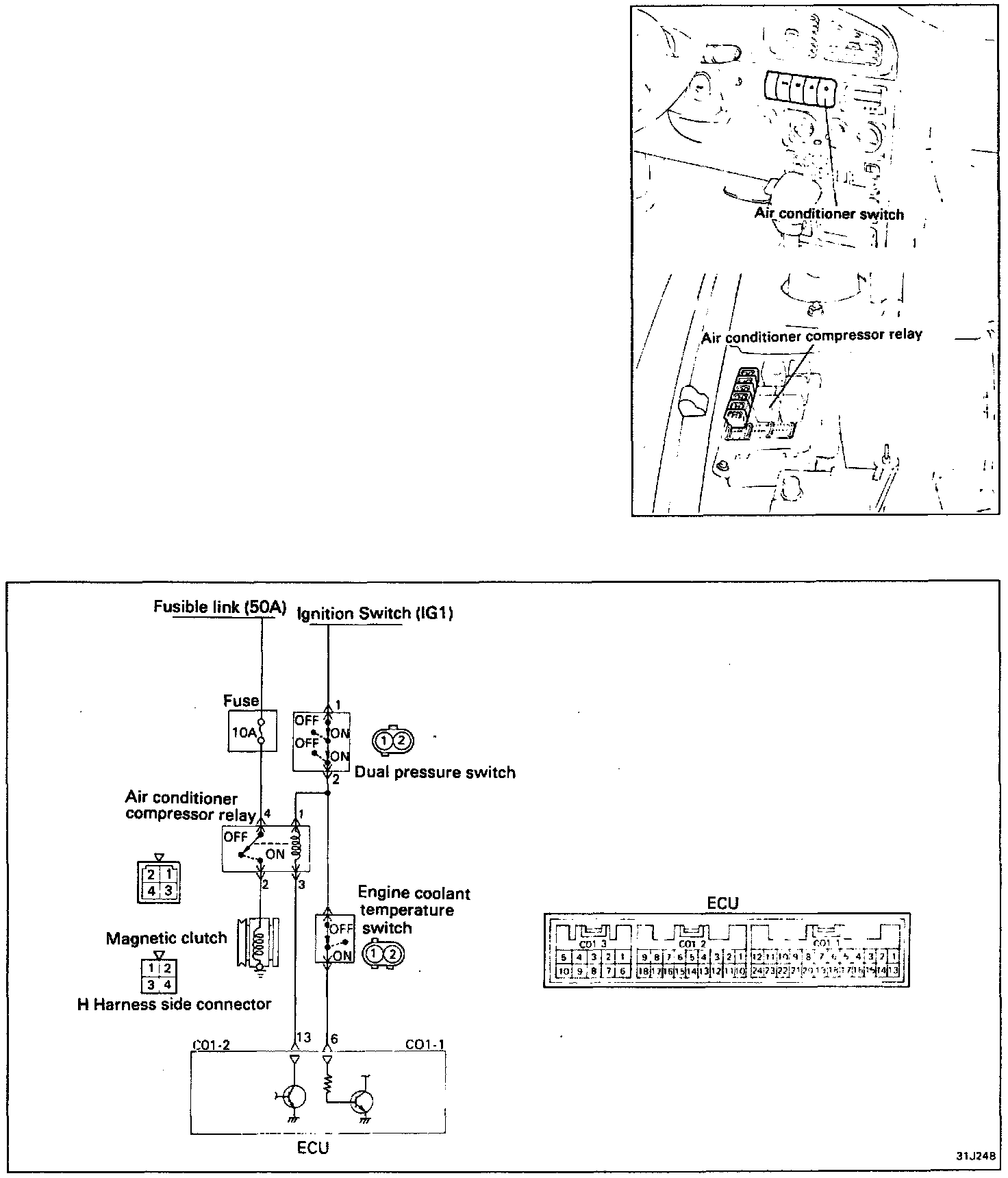 NOTE: If the engine temperature is above approximately 235° F, the coolant temperature switch will open the circuit between the A/C control unit and the ECU.