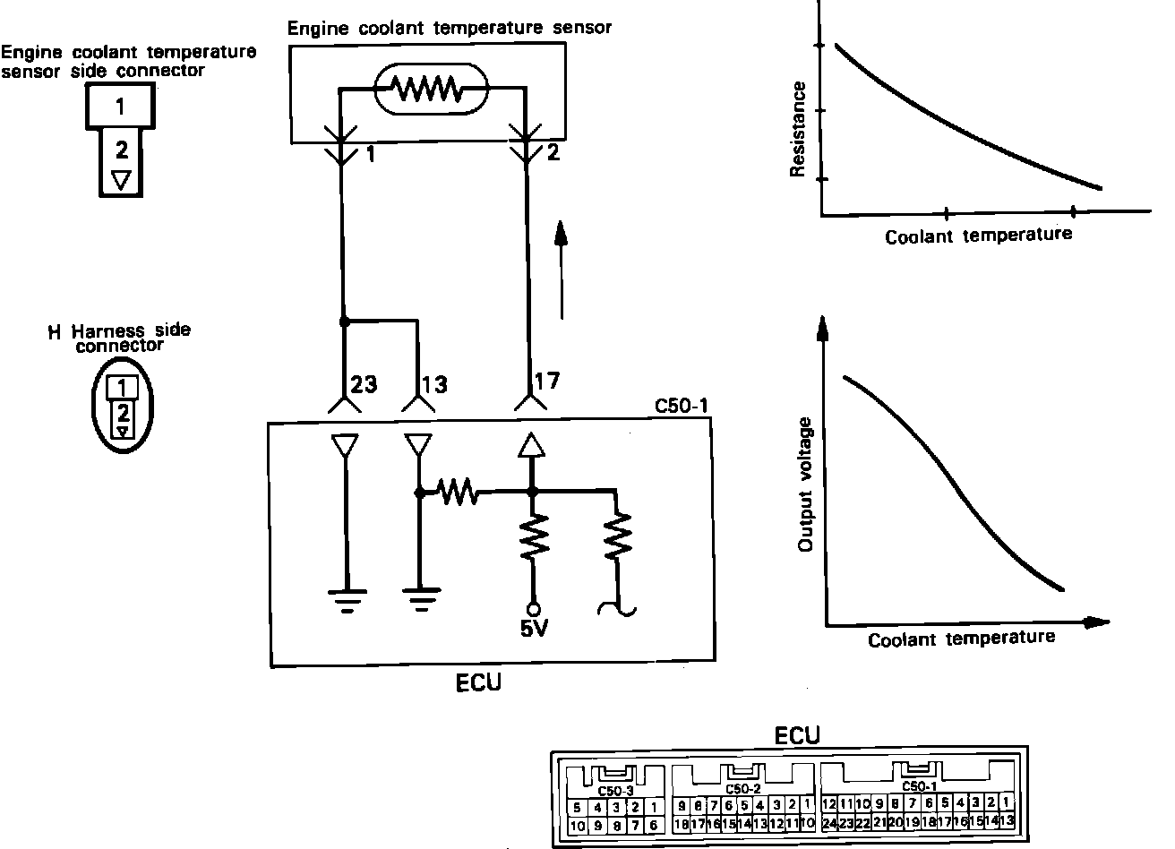 As engine temperature increases, sensor resistance decreases. The ECU monitors engine temperature by the sensor output voltage and provides optimum fuel enrichment when the engine is cold.
