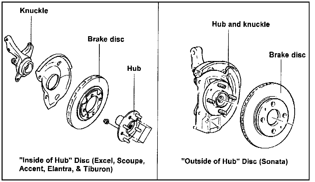 Hyundai vehicles use two methods of attaching front brake discs. On Excel, Scoupe, Accent, Elantra and Tiburon models, the disc is attached on the inside of the hub assembly making it less efficient to remove for machining (see illustration). On Sonata models, the disc is attached on the outside of the hub assembly making it very easy to remove for machining (see illustration).