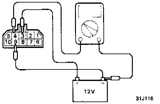 3. Connect a 12V power supply (+) terminal to the terminal 3 of the MFI control relay and measure the voltages at the terminal 4 when the (-) terminal is connected to and disconnected from the terminal 9.