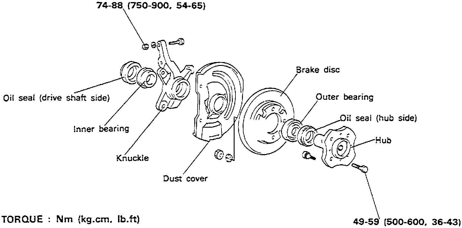 1. Remove driveshaft nut, then raise and support front of vehicle, remove front wheels.2. Disconnect brake caliper assembly and support using suitable wire.