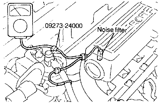 1. Install the tachometer (Disconnect the noise filter connectors and connect the S.S.T 09273-24000 between them. Then connect the tachometer to the S.S.T) and the timing light, or connect the scan tool to the data link connector in the fuse box.