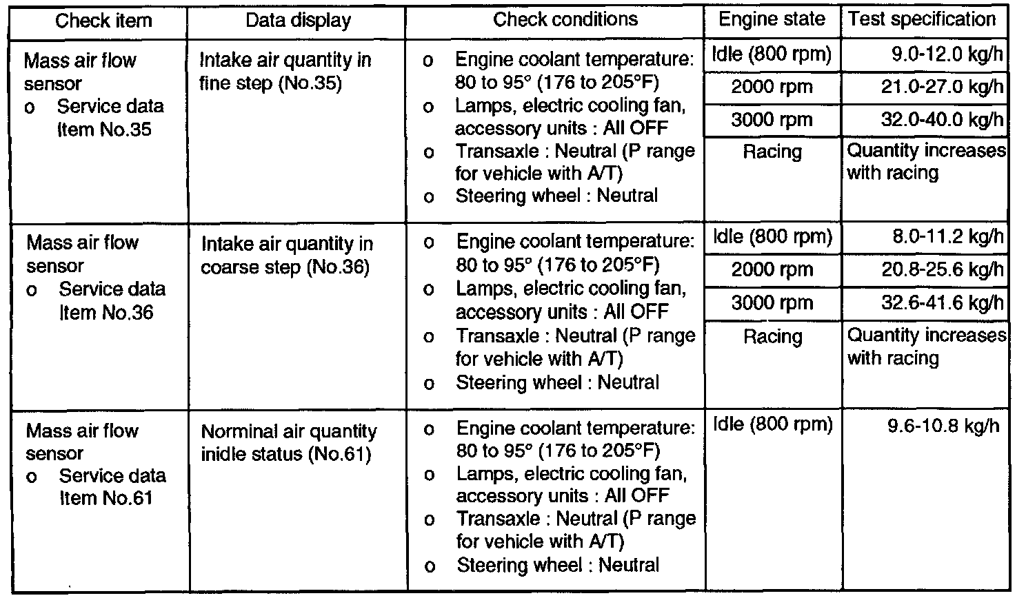NOTE: When the vehicle is new (within initial operation of about 300 miles, the mass air flow sensor air quantity may be about 10% higher.