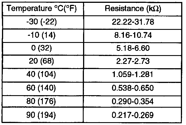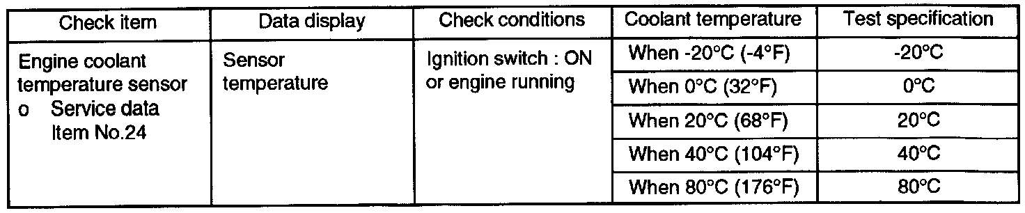The engine coolant temperature sensor is installed in the engine coolant passage of the cylinder head, detects engine coolant temperature and emits signals to the engine control module. This part employs a thermistor which is sensitive to changes in temperature. The electric resistance of a thermistor decreases in response to temperature rise. The engine control module judges engine coolant temperature by the sensor output voltage and provides optimum fuel enrichment when the engine is cold.
