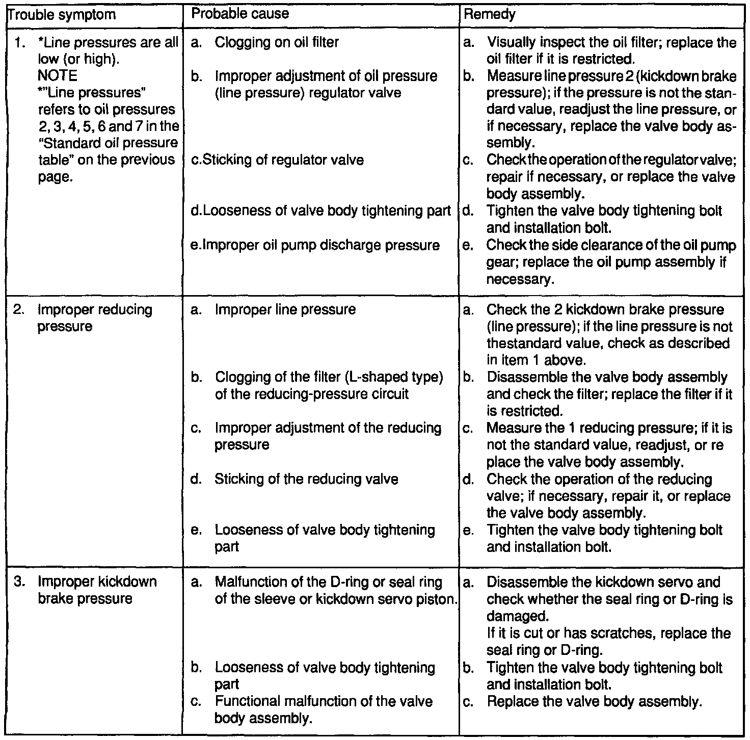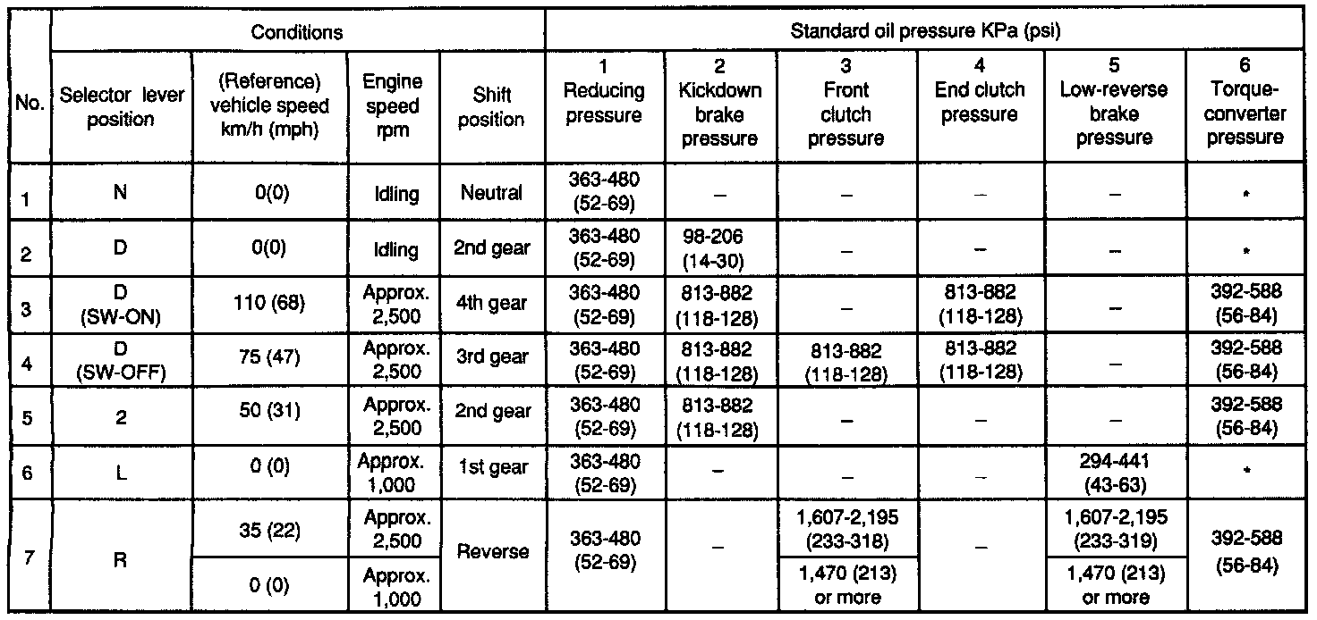5. Measure the oil pressure under various conditions. Check to be sure that the measured results are within the standard value range shown in the "Standard Oil Pressure Table" below. If the oil pressure is not within the specified range, check and repair as described in "Preliminary Steps If Oil Pressure Is Not Normal.