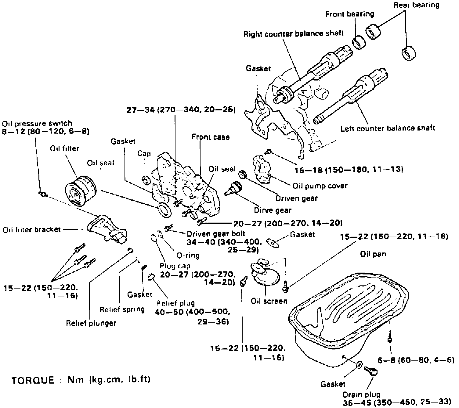 6. Remove oil pump driven gear and left counterbalance shaft retaining bolt, front case assembly, then the two counterbalance shafts from cylinder block.