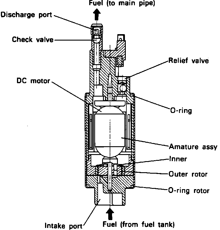 The fuel pump is a submersed circumference flow pump comprised of a DC motor, impeller, pump casing, and pump cover. The assembly utilizes an inlet filter, a pressure relief valve, and a check valve. The fuel pump is controlled by the Electronic Control Module (ECM) through the control relay. Fuel enters the inlet port through the tank filter and flows inside the motor to the discharge port. The discharge port contains a check valve to maintain residual fuel pressure when the pump is shut off. If fuel flow to the injection manifold is obstructed, fuel pressure is bypassed to the inlet port by the pressure relief valve.