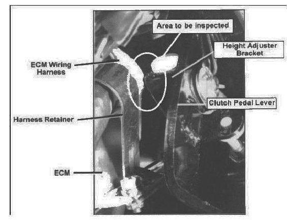 2. Inspect the area between the clutch pedal lever height adjuster bracket and ECM (see photo). Verify the bracket does not contact the ECM wiring harness as the pedal is depressed and released. The minimum clearance between the bracket and ECM harness should be 3/8" (10 mm).