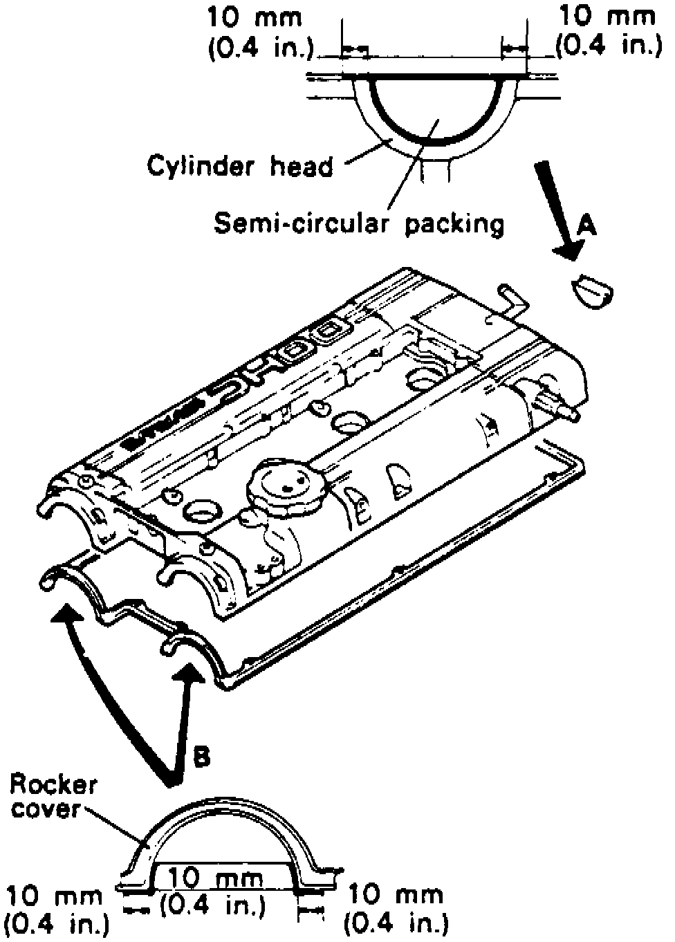 8. Apply sealant to rocker cover as shown in Fig. 29. "A" portion uses Threebond No. 10 or equivalent and "B" portion uses Threebond No. 1212D or equivalent.