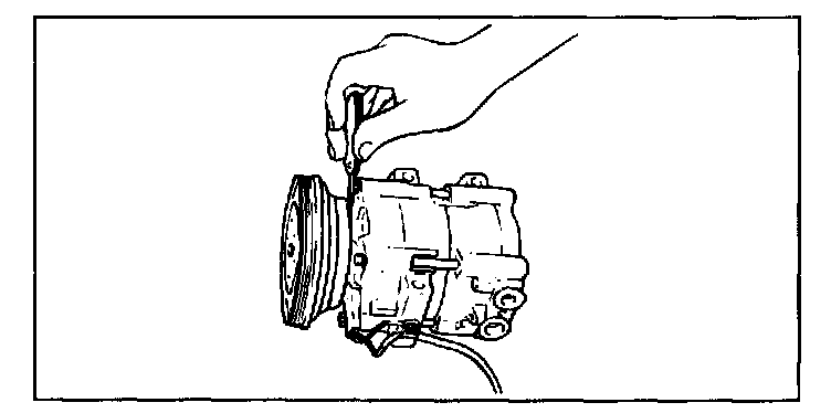 6. Check the clutch air gap between the clutch hub and the pulley mating surfaces with a feeler gauge. The air gap should be as follows: