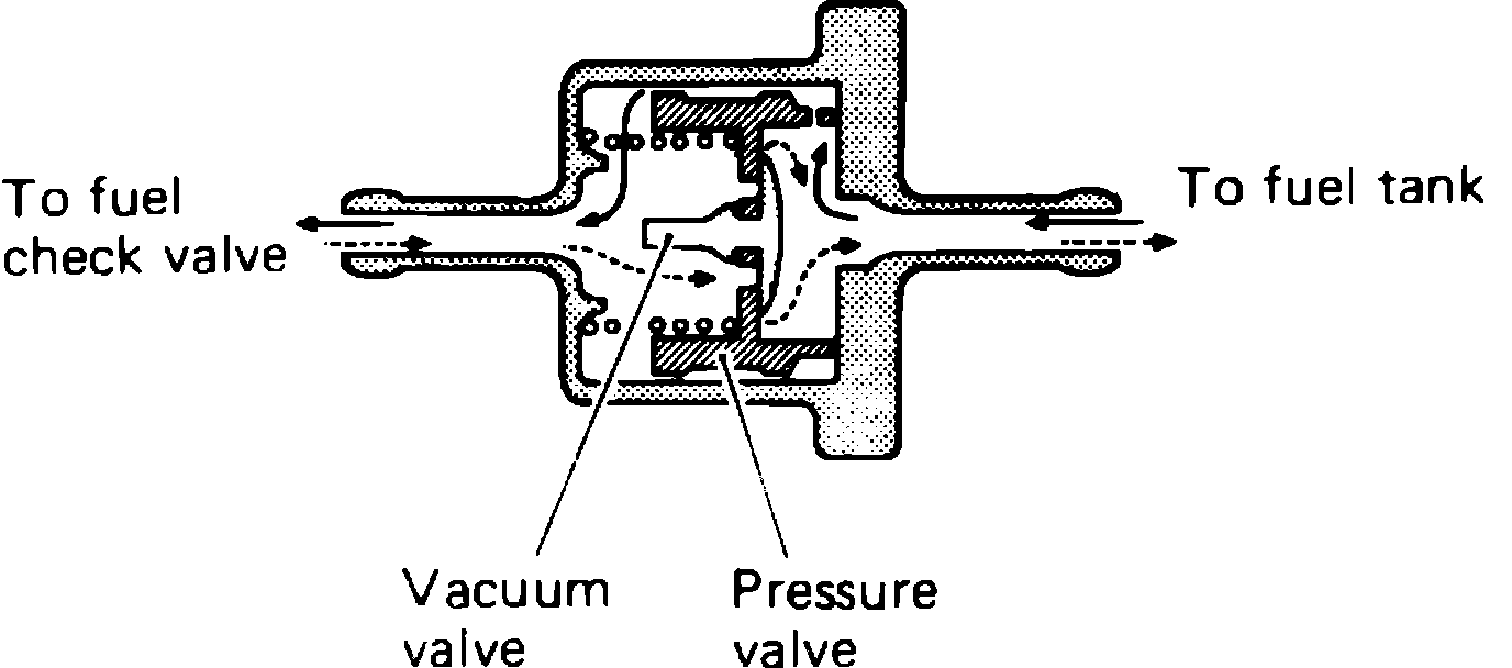 Pressure and vacuum valve to preserve fuel tank integrity. The pressure valve is designed to open when the fuel tank internal pressure exceeds atmospheric pressure and the vacuum valve opens when a vacuum has been produced in the tank.