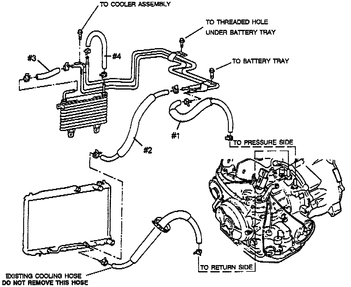 5. Remove transaxle cooling hose, and discard (PRESSURE SIDE ONLY, SEE DIAGRAM).