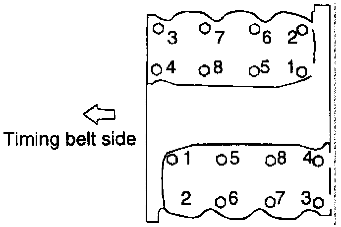 6. Remove cylinder head bolts using tool No. 09221-32001, or equivalent. Slowly loosen cylinder head bolts in sequence shown in Fig. 3.