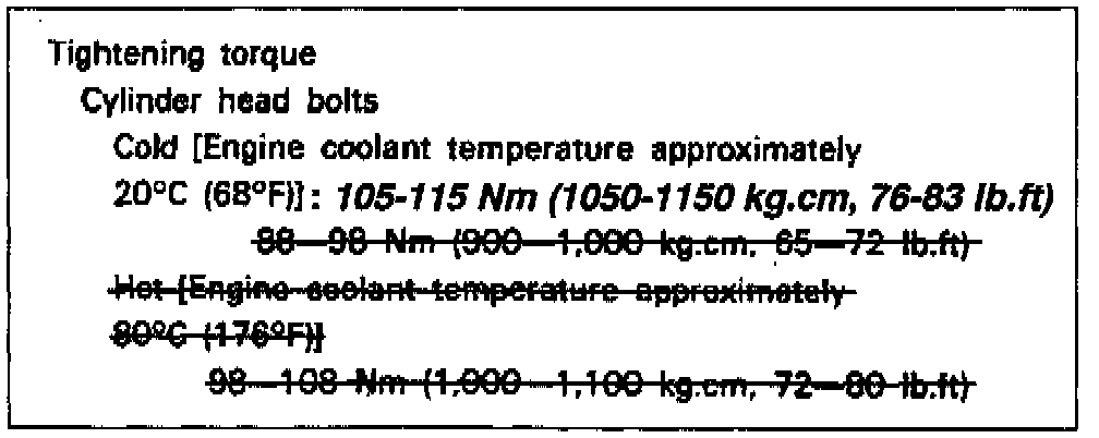 The cylinder head bolt torque specification for the Sonata 3.0L listed in 1989/1990, 1991 and 1994-1998 Sonata Shop Manuals is incorrect. The correct torque specification is 105-115 Nm (1050-1150 kg.cm, 76-83 lb.ft).