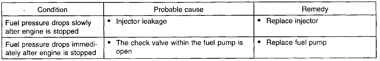 10. Stop the engine and check for a change in the fuel pressure gauge reading, which should hold for approximately 5 minutes. If the gauge indication drops, observe the rate of drop. Determine the probable causes and repair them according to the following table.