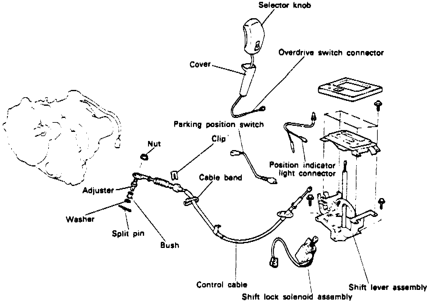 c. Pull on inner cable to ensure all slack is removed, then connect cable to PNP switch arm, loosen and move adjustment pin on PNP switch arm if necessary to ensure slack free installation.
