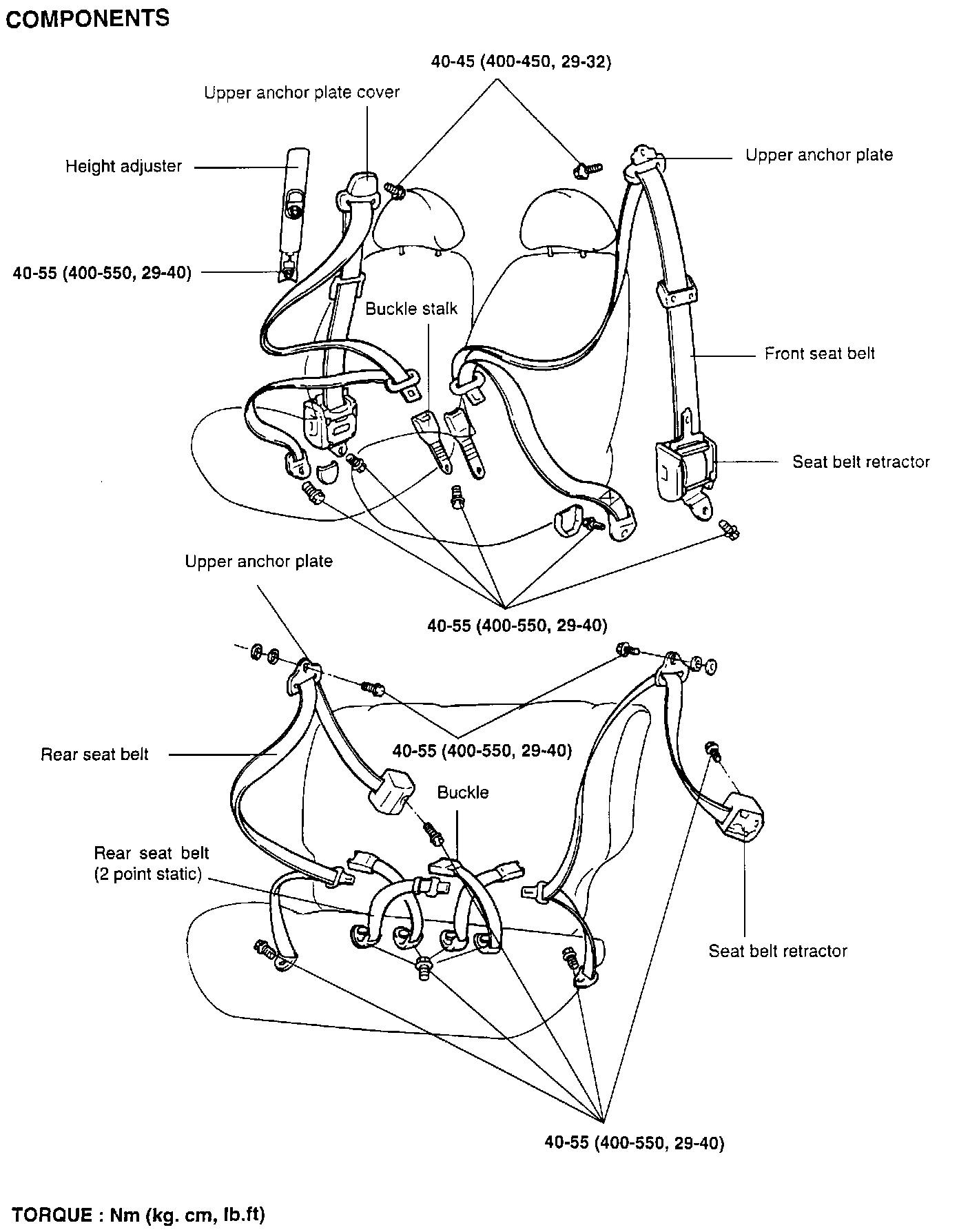 Upper anchor mounting bolt: 40-45 N.m (400-450 kg.cm, 29-32 lb.ft)
