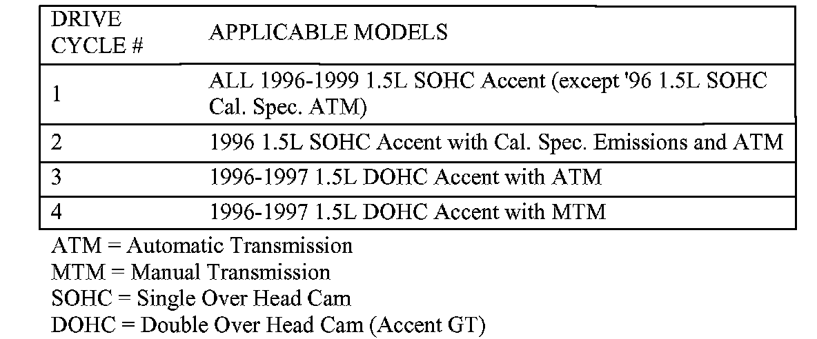 There are four (4) different Drive Cycles included in this TSB, depending on the Model Year and Specifications of the Accent.
