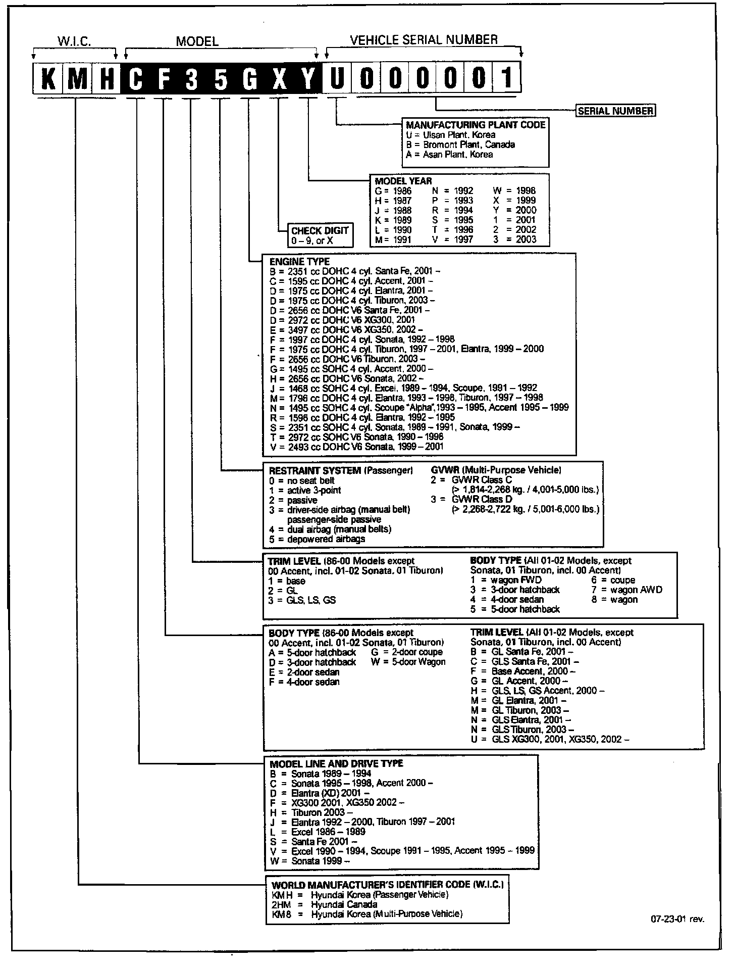 This bulletin provides information concerning the vehicle identification number (VIN) for all U.S. Specification Hyundai models. Refer to the illustration for definitions for each of the seventeen (17) characters in the VIN sequence.