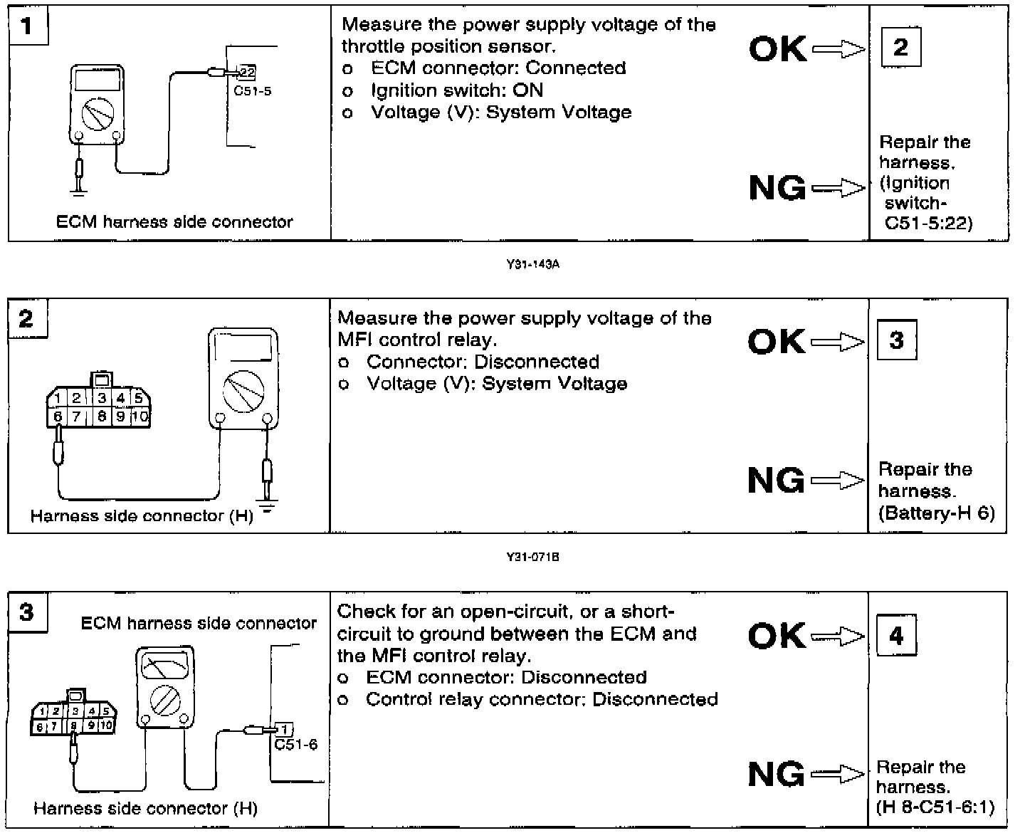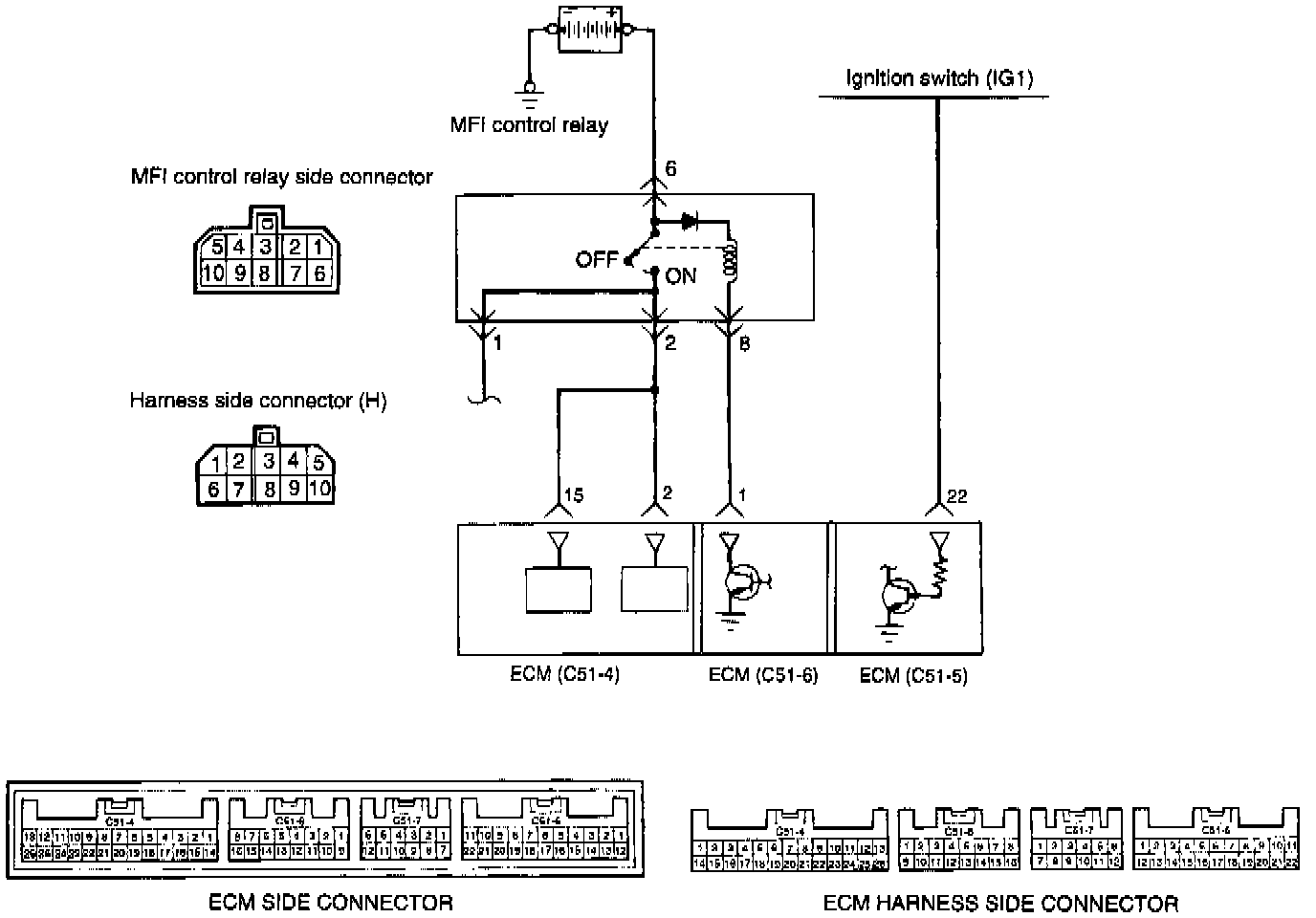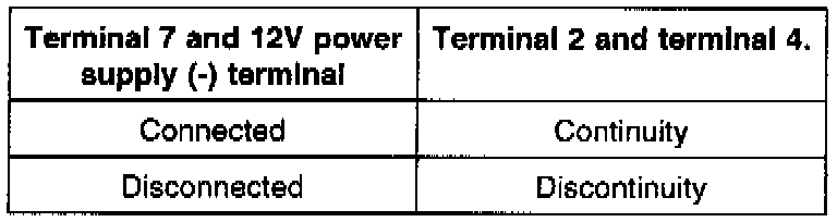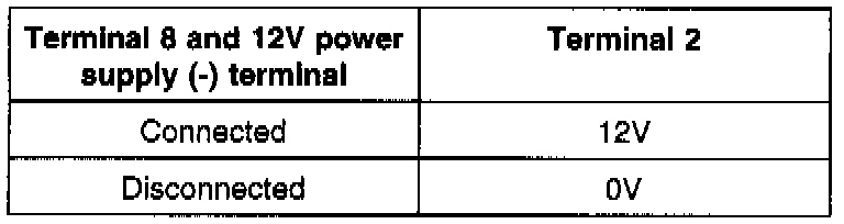 1. Connect a 12V power supply (+) terminal to the terminal 6 of the MFI control relay and measure the voltages at terminal 2 when the (-) terminal is connected to and disconnected from the terminal 8.
