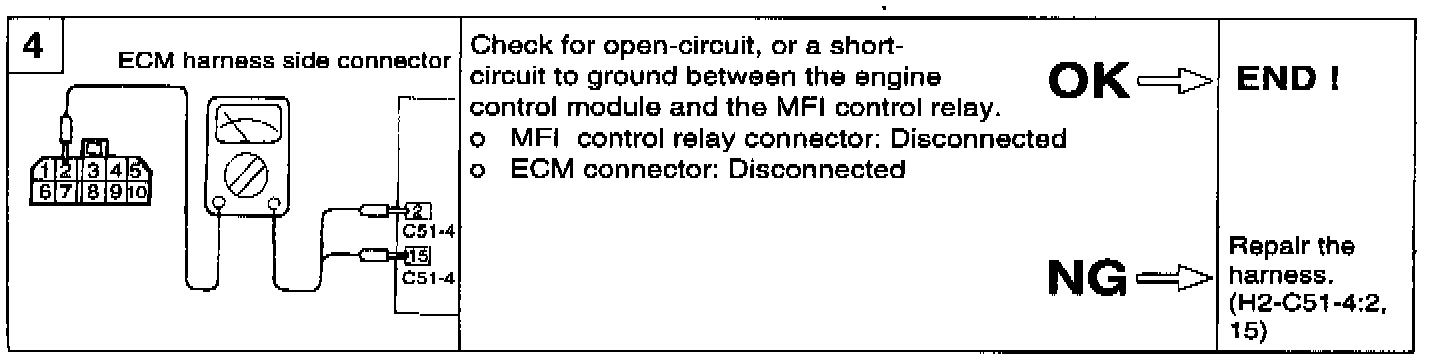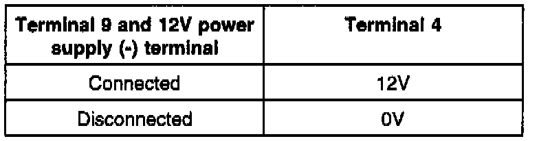 3. Connect a 12V power supply (+) terminal to the terminal 3 of the MFI control relay and measure the voltage at the terminal 4 when the (-) terminal is connected to and disconnected from the terminal 9.