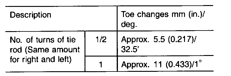 - Toe-in adjustment should be made by turning the right and left tie rods by the same amount.