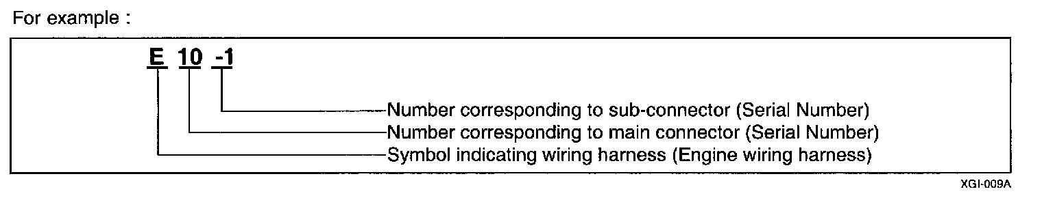 A connector identification symbol consists of a wiring harness location classification symbol corresponding to a wiring harness location and number corresponding to the connector. These connector locations can be found in the HARNESS LAYOUTS.