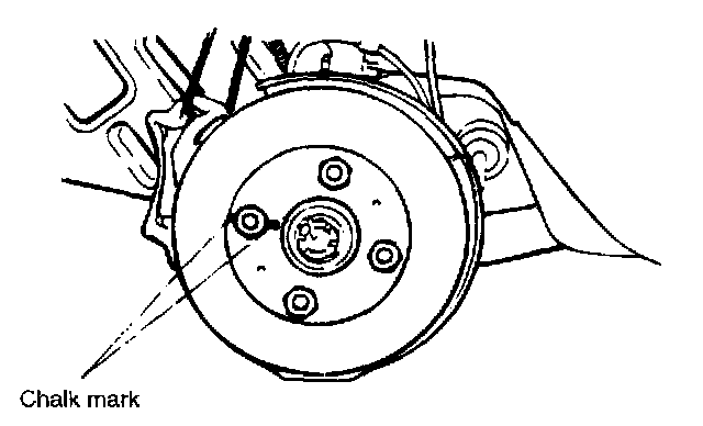 1 Before removing the brake disc, chalk both sides of the wheel stud on the side at which the runout is greatest.