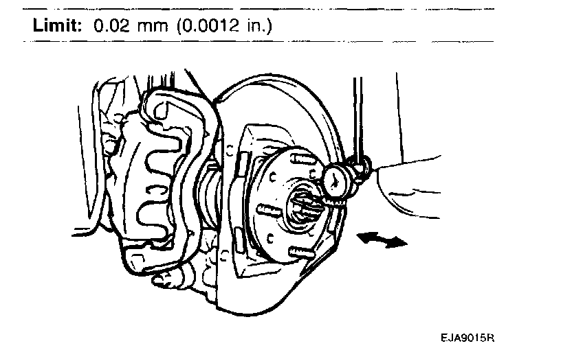 2 Remove the brake disc, and then place a dial gauge as shown in the illustration; then move the hub in the axial direction and measure the runout.