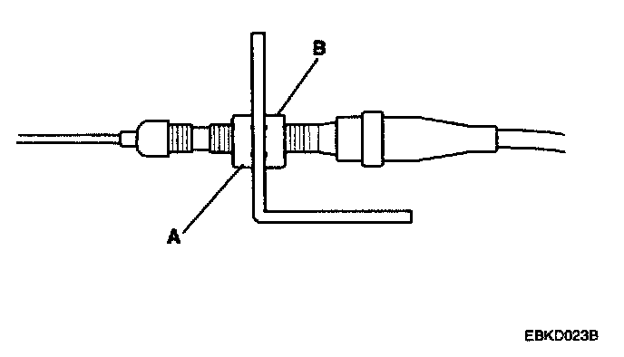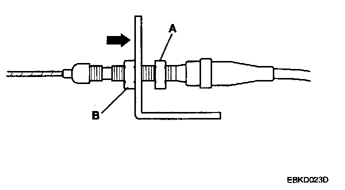 6. Pull the cable so that the adjusting nut (A) touches the bracket. and tighten the locknut (B).