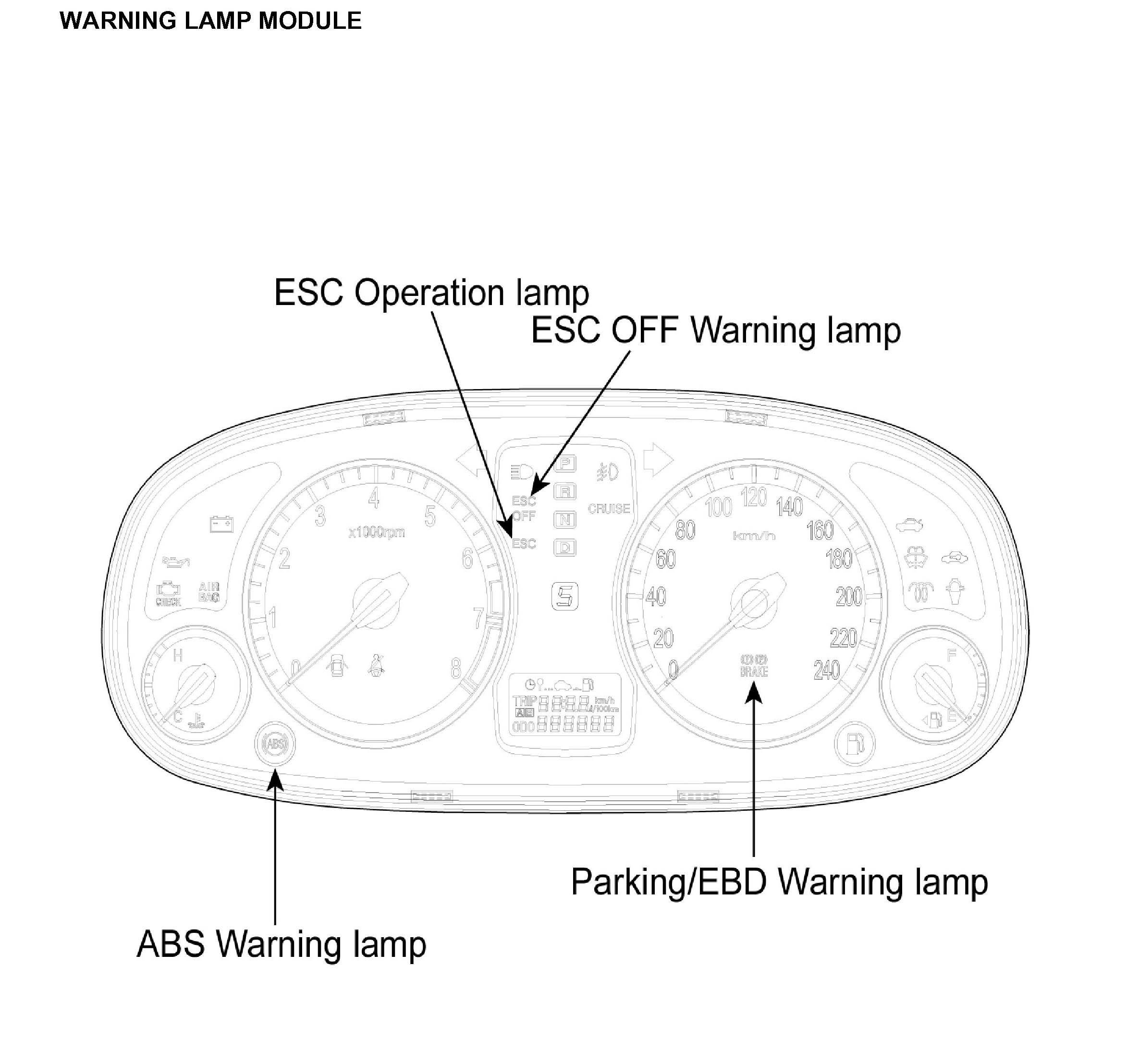 2. PARKING/EBD WARNING LAMP MODULE The active EBD warning lamp module indicates the selftest and failure status of the EBD. However, in case the Parking Brake Switch is turned on, the EBD warning lamp is always turned on regardless of EBD functions. The EBD warning lamp shall be on: