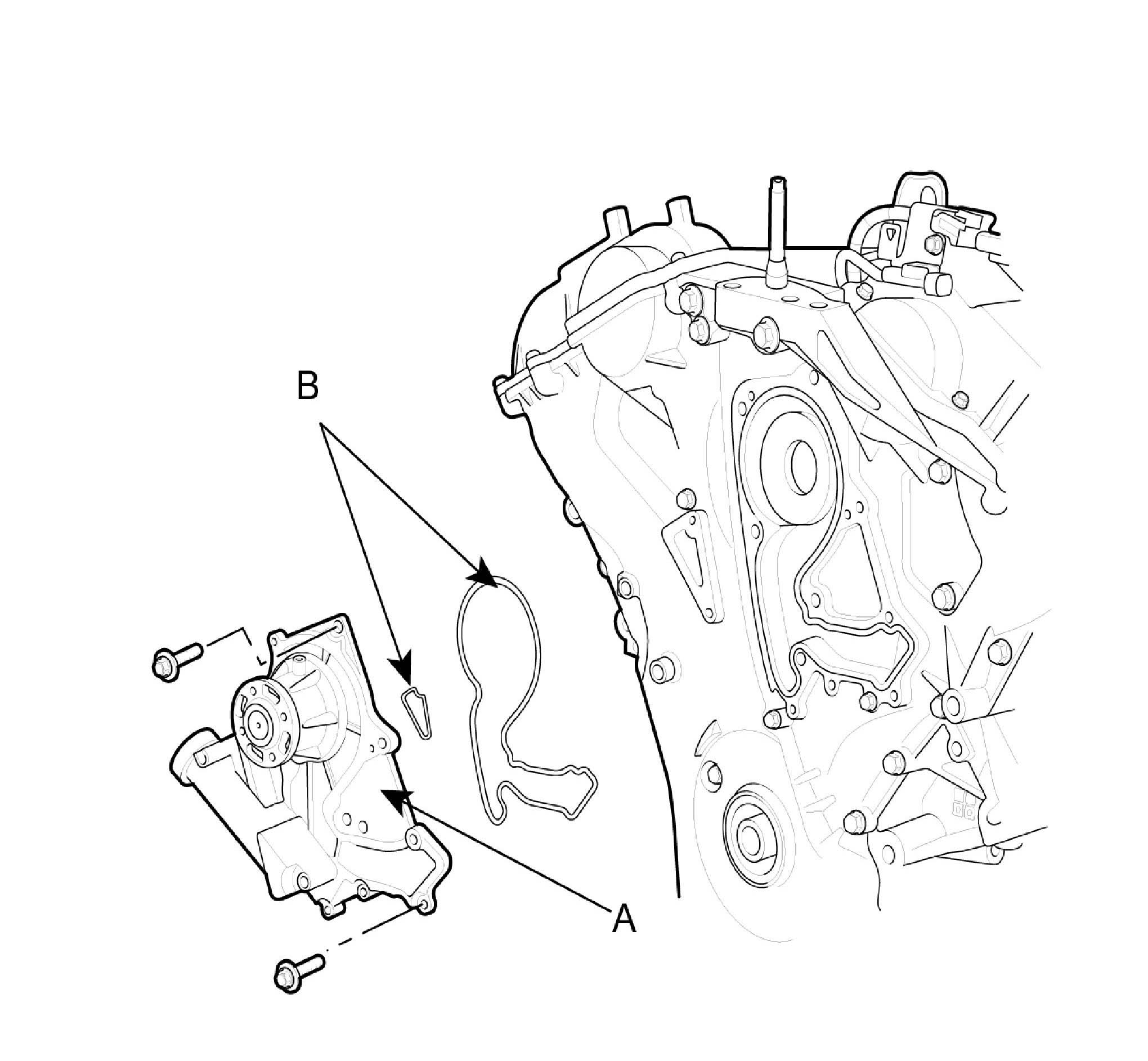 1. Install the water pump (A) and a new gasket (B) with 12 bolts.