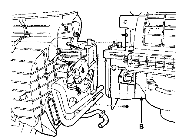 5. Remove the blower unit (A) from the heater unit after loosening a mounting bolt and 3 screws.