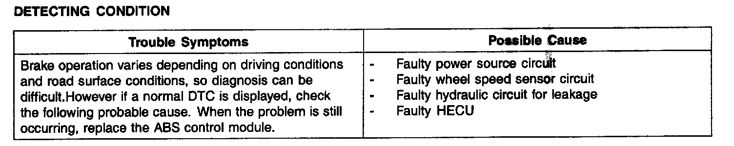 ^ Check the harness or connector between the fuse (10A) in the engine compartment junction block and the ABS control module. Repair if necessary.