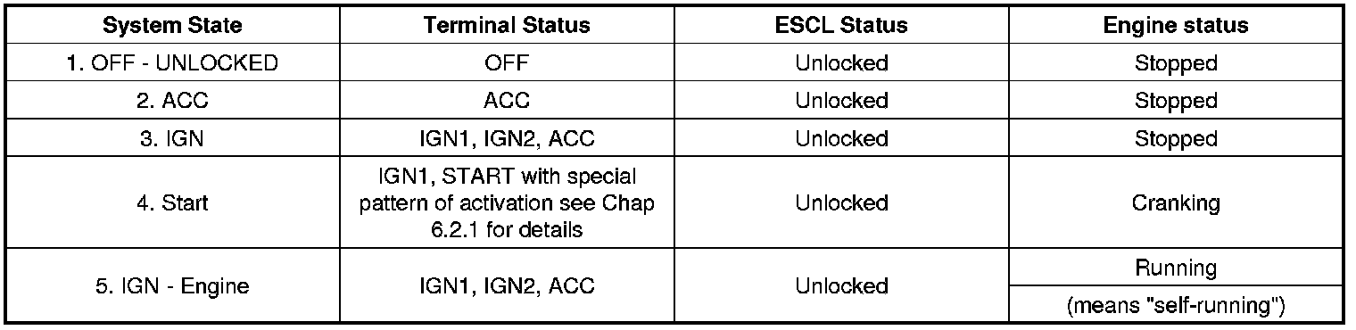 The BES System can be set in 5 different states (OFF LOCKED is not available in virgin mode), depending on the status of the terminals, ESCL and Engine status: