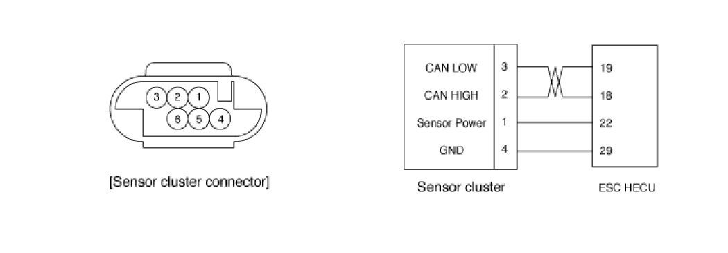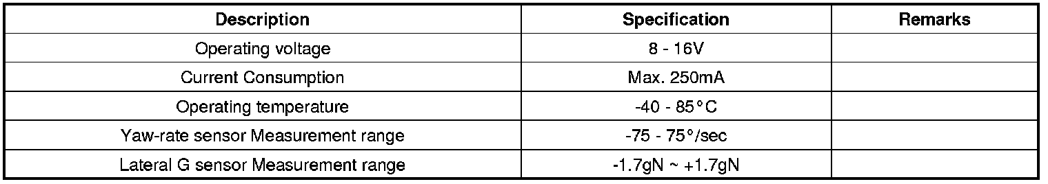The ESC system is the shorten word of Electronic Stability Control system. This system recognizes a critical driving condition by Yaw-rate sensor, Lateral acceleration sensor and Steering angle sensor. And then it stabilizes the vehicle by a individual wheel braking and engine torque control through CAN communication. Among components of this system, the yaw-rate & lateral G sensor is installed on the lower of the center console. The yaw-rate and lateral G sensor are installed together in the one container which is called as " Sensor cluster". When the vehicle is moving around a vertical axis, the yaw rate sensor senses the vibration changes of the plate-fork installed in the yaw-rate sensor. When the vehicle's yawing is sensed and the yaw velocity reaches a certain velocity, the ESC control is activated. The lateral G sensor senses a vehicle's lateral acceleration. A small element in the sensor is attached to a deflectable lever-arm. The HECU recognizes a vehicle's direction and a lateral acceleration by the lateral G sensor.