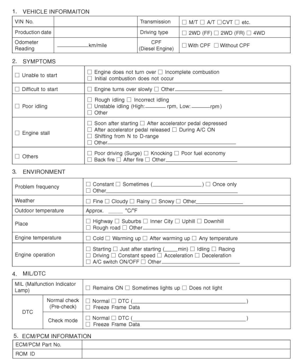 Sometimes the most difficult case in troubleshooting is when a problem symptom occurs but does not occur again during testing. An example would be if a problem appears only when the vehicle is cold but has not appeared when warm. In this case, the technician should thoroughly make out a "Customer Problem Analysis Sheet" and recreate (simulate) the environment and condition which occurred when the vehicle was having the issue.